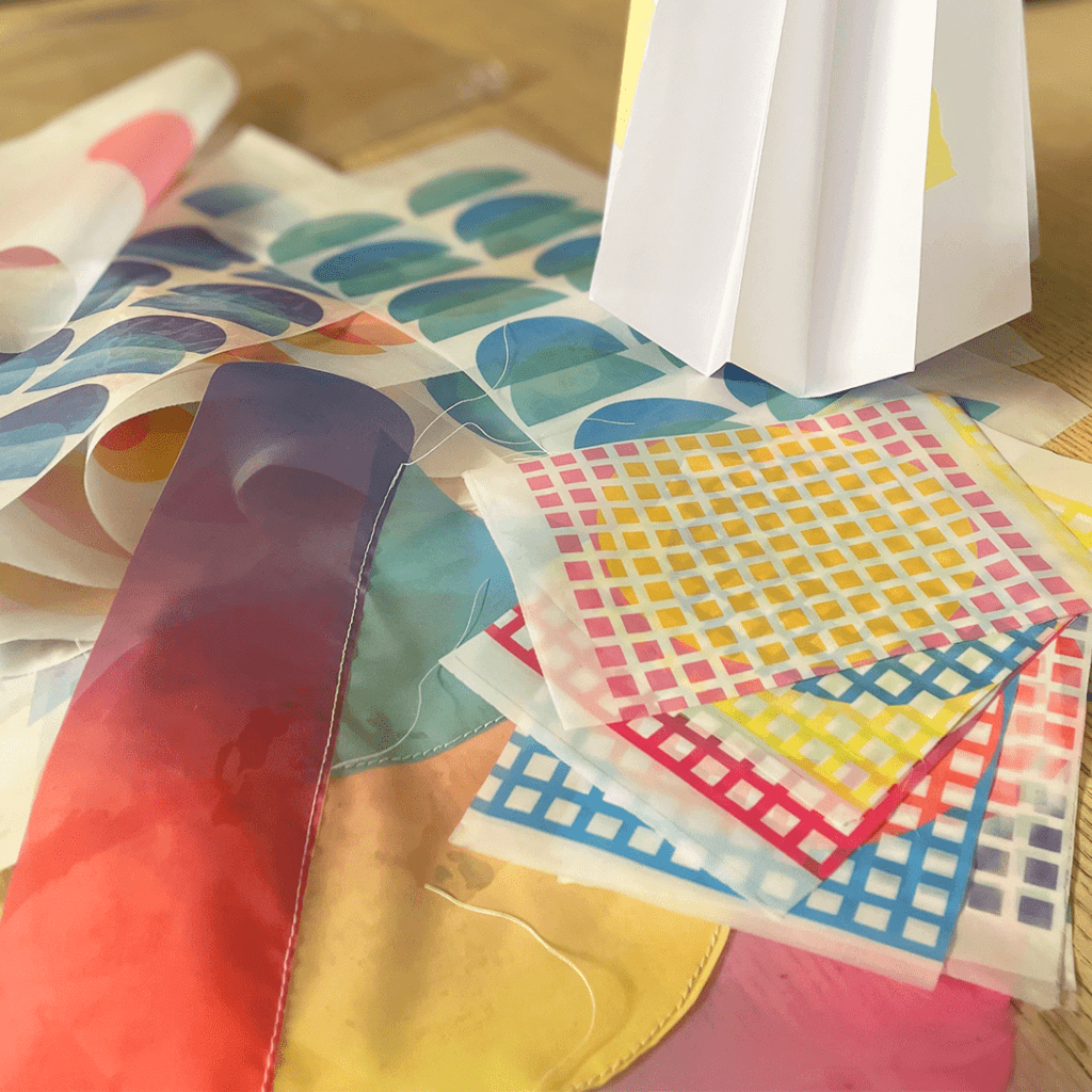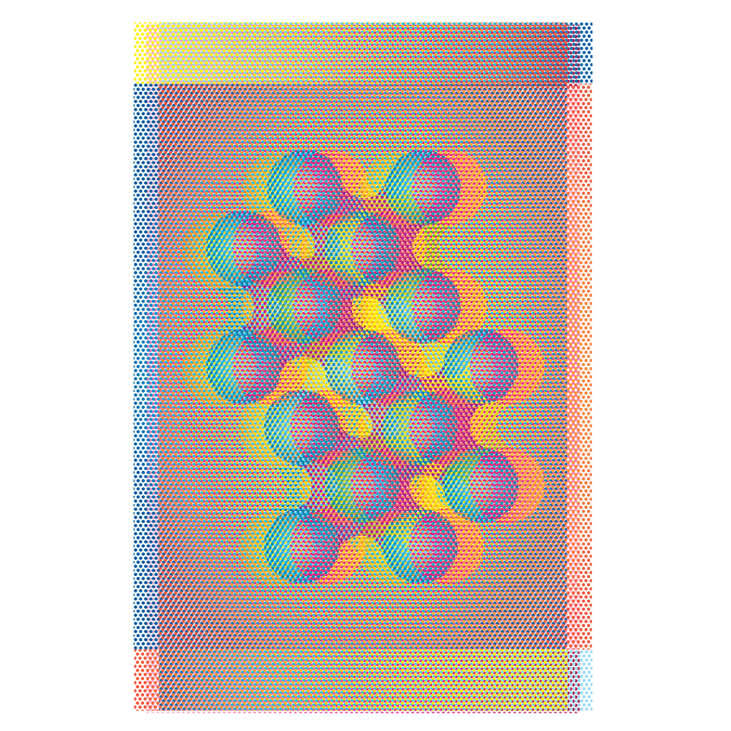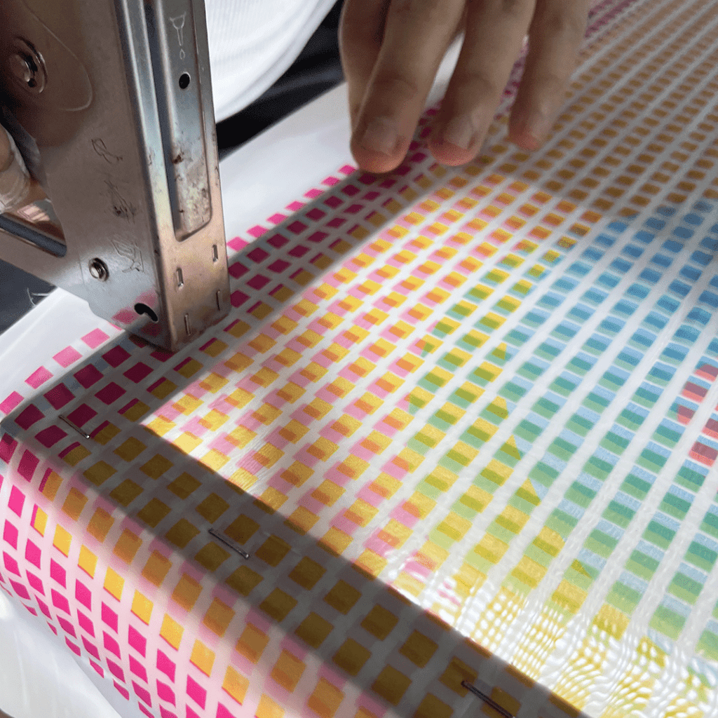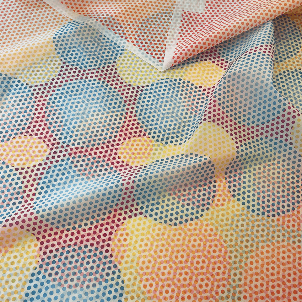 Each work consists of three layers of semi-transparent polyester, printed with fragments of color. The layered images, resembling a mosaic or digital pixels, create a vibrant optical phenomenon. By combining the RGB color model with textile-inspired layering, I brought together digital and analog techniques, blending technology and tradition. The work was printed at Toptex Textile, Petach Tikva.